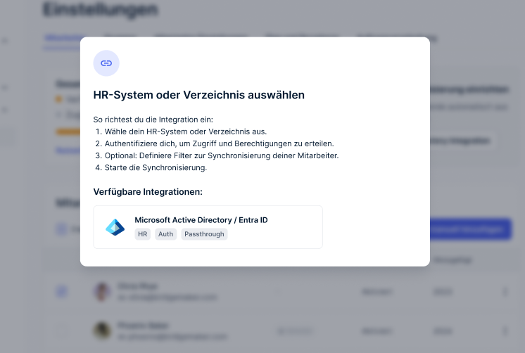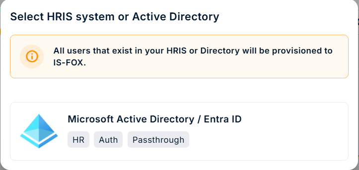 Currently only Microsoft Entra (Microsoft Active Directory). But most systems are supported via Unified.to, including HRIS like Personio (In progress) and IDPs like Google Workspace. If you want your provider to be supported contact us at support@is-fox.de