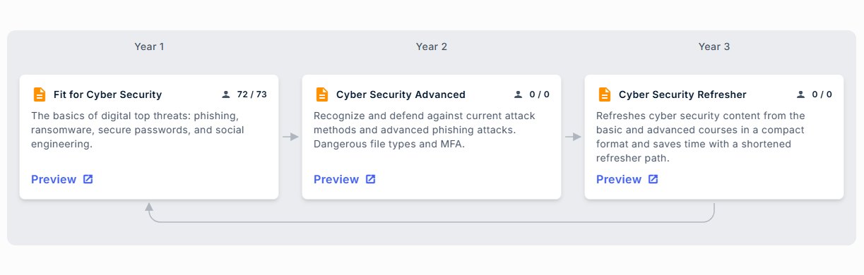 When you enroll an participants, they will start with the first phase of the training. Different users can be at different steps of their journey (e.g. some at year 1 and some at year 3), this is not a problem, as we track the course completion across all the different years. For example, anyone who passes the first phase automatically switches to the second phase in the second year.